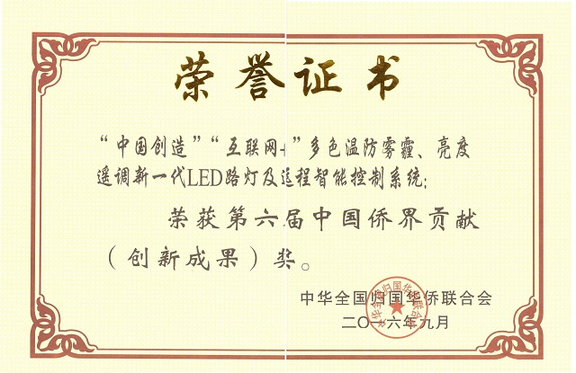 我司研發(fā)制造的“中國(guó)創(chuàng)造”“互聯(lián)網(wǎng)+”多色溫防霧霾、亮度遙調(diào)新一代LED路燈及遠(yuǎn)程智能控制系統(tǒng)于2016年9月榮獲第六屆中國(guó)僑界貢獻(xiàn)(創(chuàng)新成果)獎(jiǎng)。